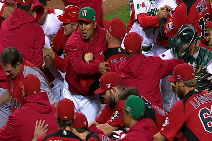 PHOENIX - En el desenlace del partido entre México y Canadá en el Grupo D del Clásico Mundial de Béisbol el sábado, se desató una enorme trifulca entre las novenas de ambos países durante la primera parte del noveno episodio.